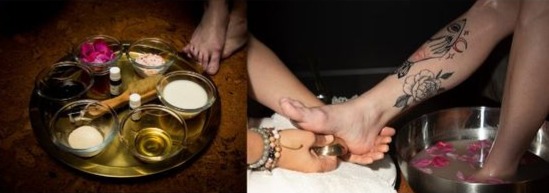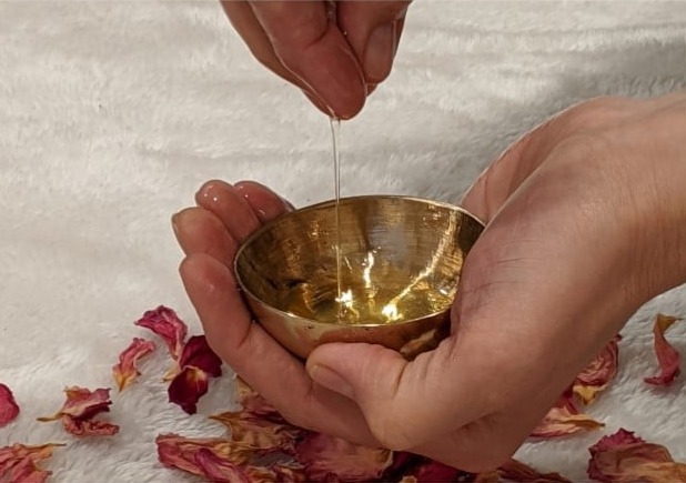 Un massage divin qui procure une grande détente, enracine et aide à équilibrer le corps et l’esprit. On prend le temps de se déposer et d’ouvrir cet espace sacré ensemble. On débute ensuite par un nettoyage des pieds et des jambes, dans un bain de pieds royal composé de pétales de roses, d’huiles essentielles, d’herbes, de lait et de ghee. Suivi d’une exfoliation au miel des pieds et des jambes. Ensuite, débute le massage au bol Kansu effectué à l’aide de ghee (beurre clarifié) et d’une huile végétale biologique (sésame, tournesol), qui vient équilibrer les trois doshas (vata/pitta/kapha). Le tout accompagné d’une infusion avec des herbes ayurvédiques biologiques.